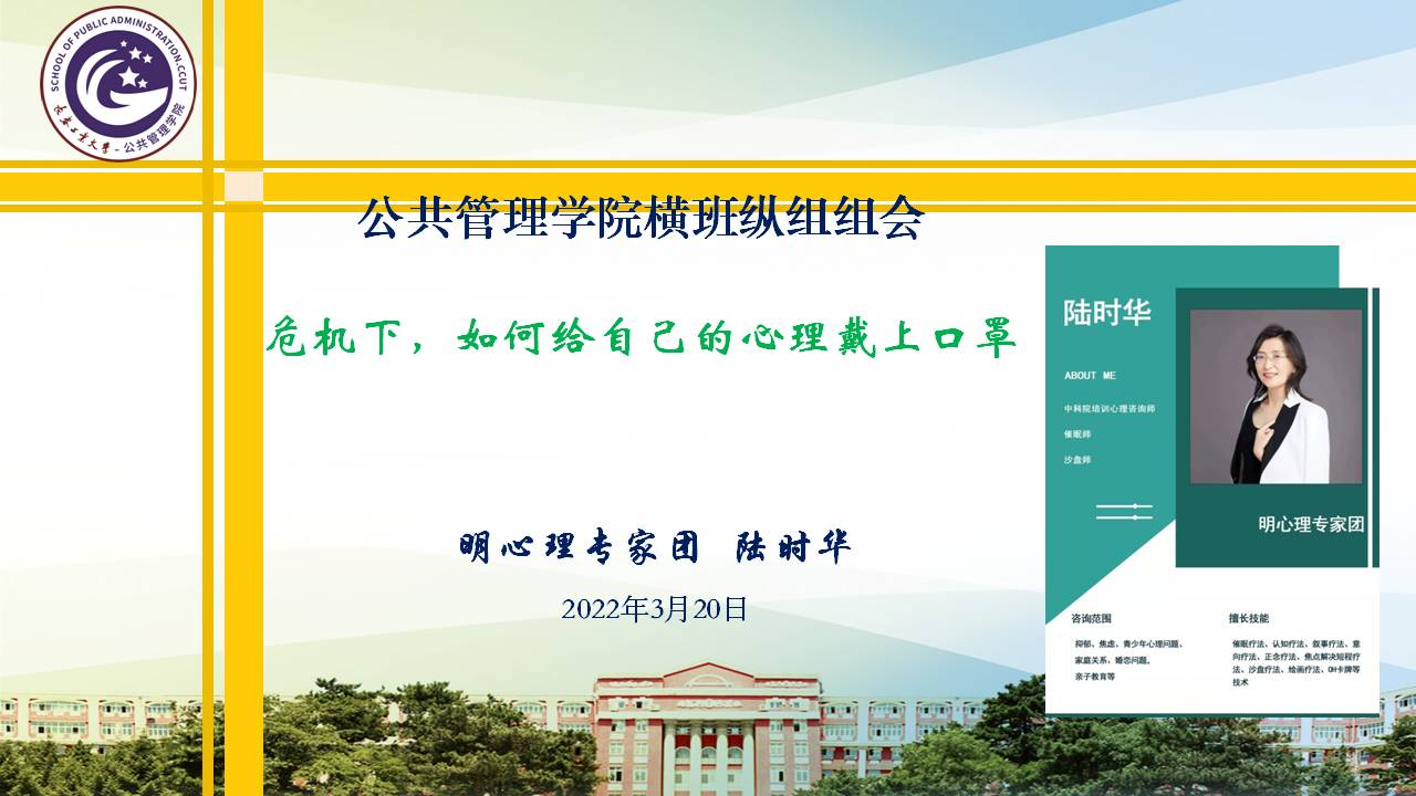为缓解学生在疫情危机下的负面情绪,正确引导学生应对危机事件,2022年3月20日,pg电子官方网站公共管理系韩小威、姜雨峰两位老师召开“横班纵组”组会,邀请明心理专家团讲师陆时华为同学们作了《危机下,如何给自己的心理戴上“口罩”》的心理讲座。