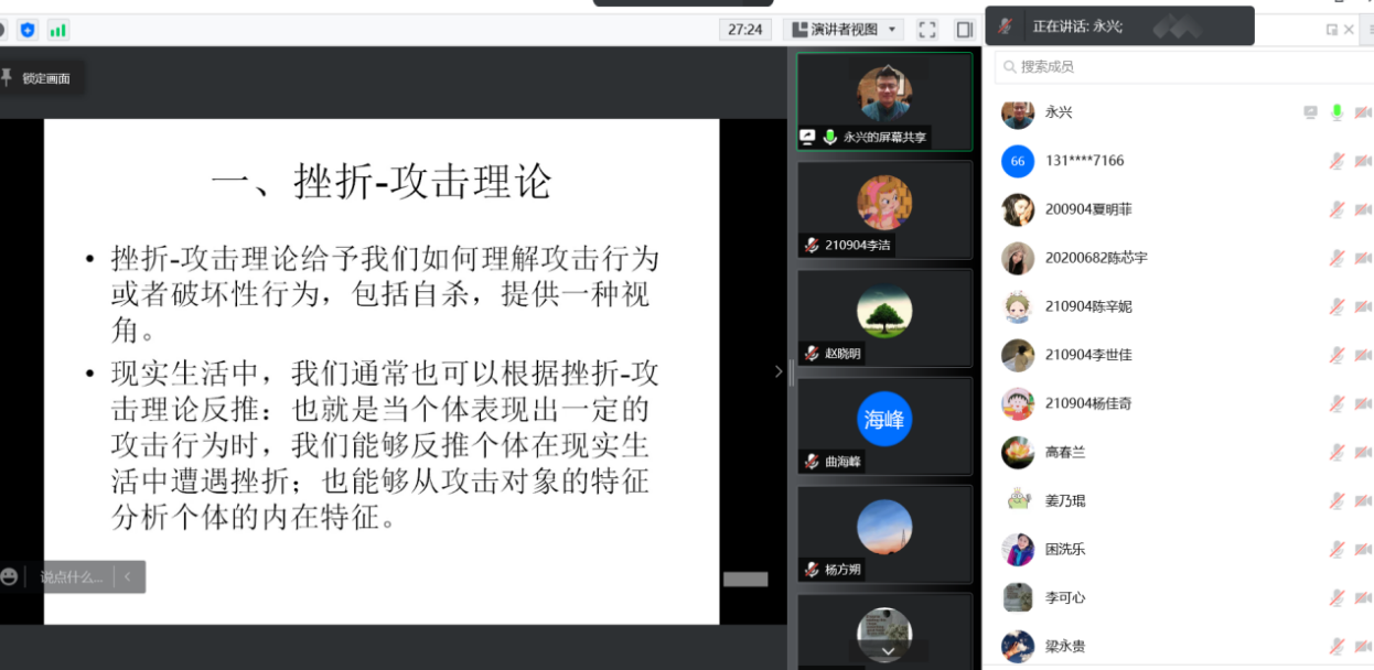 刘老师围绕“挫折-攻击理论”分析了在遇到挫折时人们会产生攻击行为的现象,并结合当前所处的防疫封闭管理的背景,指出了人们对攻击行为需求的强化现象——正常的生活秩序被打乱,且随着封闭隔离时间的延长,挫折感及攻击能量逐渐增加,而为了消解这一能量,宣泄的需求就变得尤为显著了。据此,刘老师引出了攻击能量消解的方式,重点讲解了如何通过快乐的情绪化解挫折感,并以形象的例证、框图等对内啡肽和多巴胺的分泌进行了区分,最后以健康作息的消解作用作为结尾,建议同学们规律作息、早睡早起。