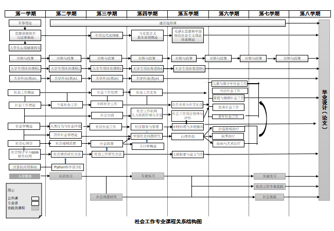 核心课程:社会工作概论、社会学概论、社会心理学、社会工作理论、人类行为与社会环境、社会政策、个案工作、小组工作、社区工作、社会行政