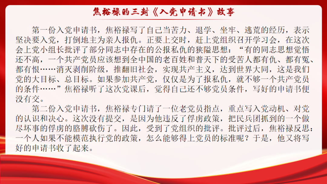 “通过本次活动,我们共同回顾了焦裕禄的入党历程。通过他的三封入党申请书我们可以知道:想要成为一名优秀的共产党员,不但要甘干吃苦、甘干奉献;也要始终坚持初心,对党忠诚,全心全意为群众谋利益;更要不断进行自我批评,严格要求自己。青年兴则国家兴,青年强则国家强,工欲善其事,必先利其器”。新时代青年唯有不断苦炼“内功”、立志“决心”、实干“担当”,方能肩负起新时代赋予的重任。”