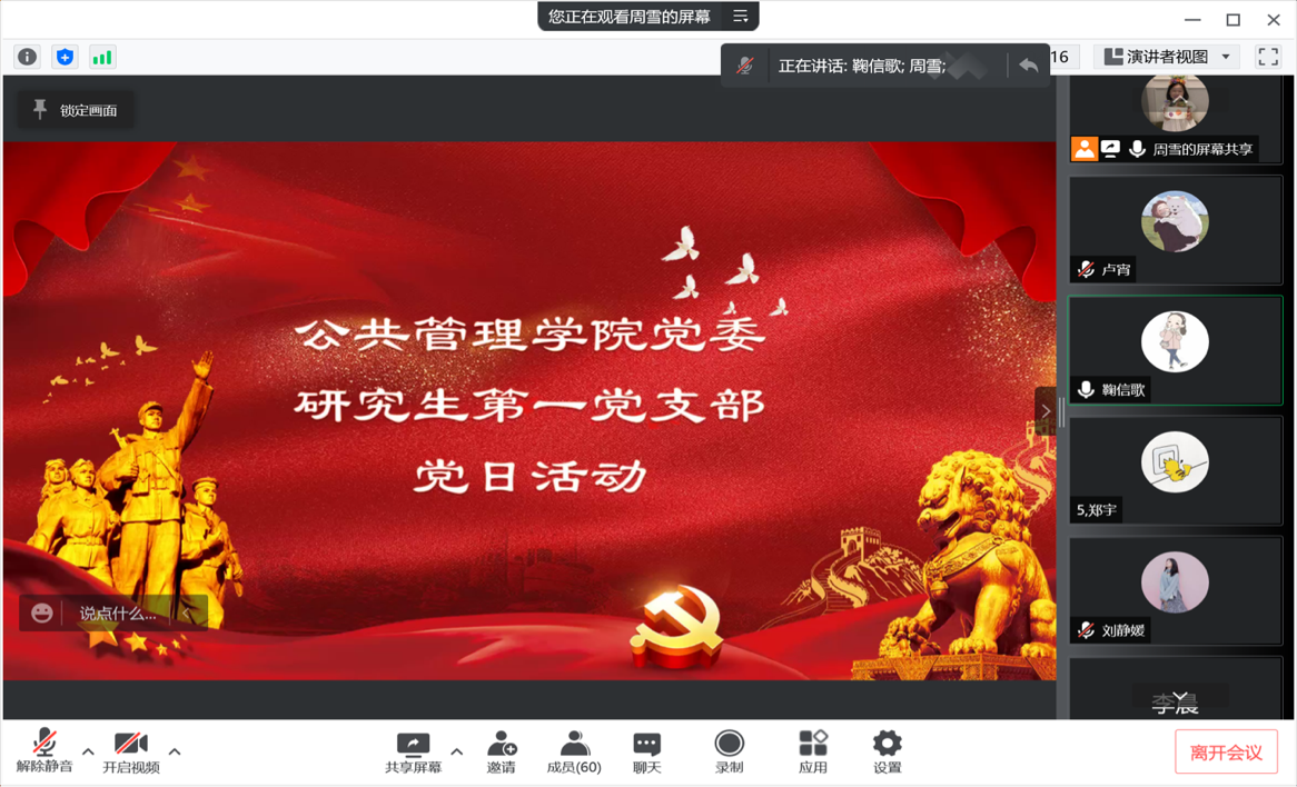 在鞠信歌老师的主持下,会议伊始,由周雪、姜秀璇和李晨三位同学宣读景俊海书记抗疫相关讲话,支部党员们认真听取并学习。