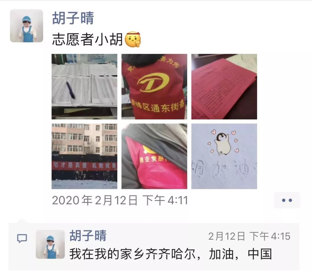 在祖国的边陲黑龙江省齐齐哈尔市,有最美逆行者,他们已经开始第四次援鄂行动,也有一直工作在医疗一线的医务工作者,还有在寒风里恶劣的天气中坚守岗位的警察同志,更有社区工作人员坚守在基层一线,守卫社区居民健康安全。而她也在里面尽自己微弱的一份力量,她叫胡子晴,是pg电子官方网站公共事业管理专业2019级的学生。她的父母,一个作为医务工作者,一个作为党员一直工作在一线。她深受父母的感召,在回到家自我隔离15天后,第一时间报了名,当了一名志愿者。