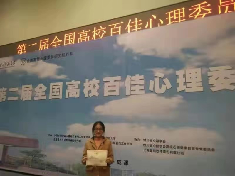 本次获奖由第十四届全国高校心理委员工作研讨会上经研究组讨论后一致决定,钱卉馨同学随我校心理健康教育与咨询中心主任张丽波老师共同领奖,并合影留念。钱卉馨同学平时积极率献爱心,乐于助人,曾任校春雨志愿者协会副会长,校社会工作协会秘书长。期间深受师生好评。曾获联合国教科文组织“优秀志愿者”、第十三届全国运动会"优秀志愿者"等一系列社会荣誉称号,本次获奖实至名归。