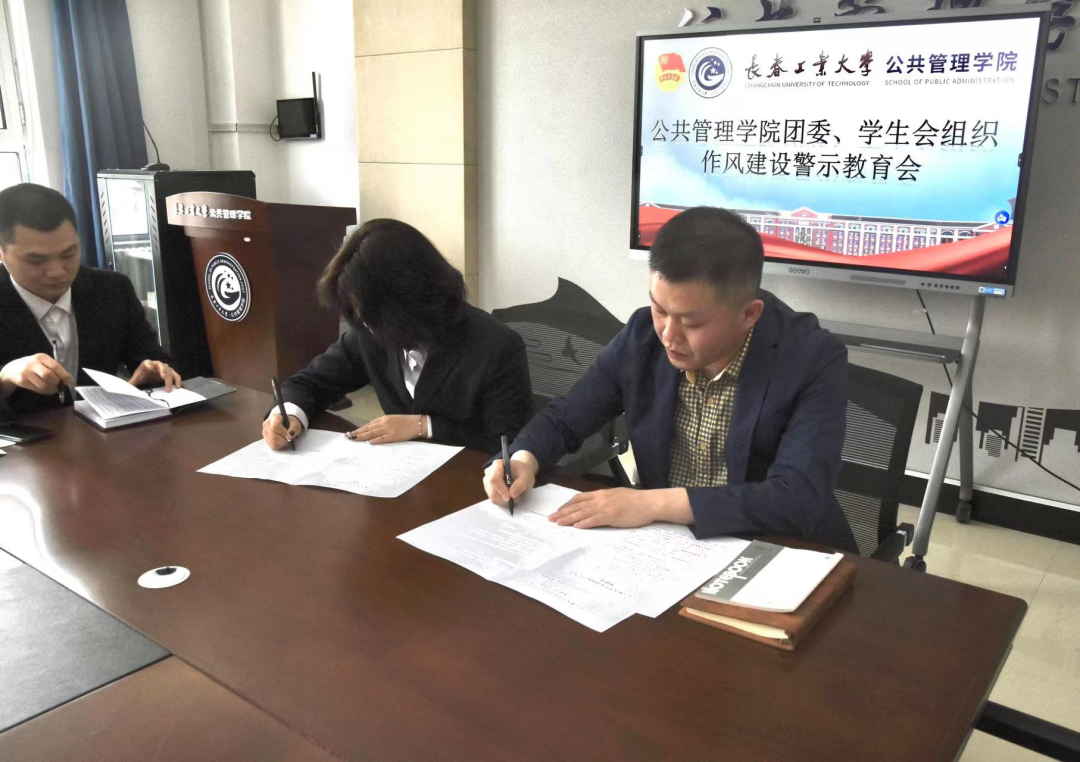各部门负责人员认真聆听陈磊老师的讲话后,在《pg电子官方网站学生会组织工作人员承诺书》中签字。