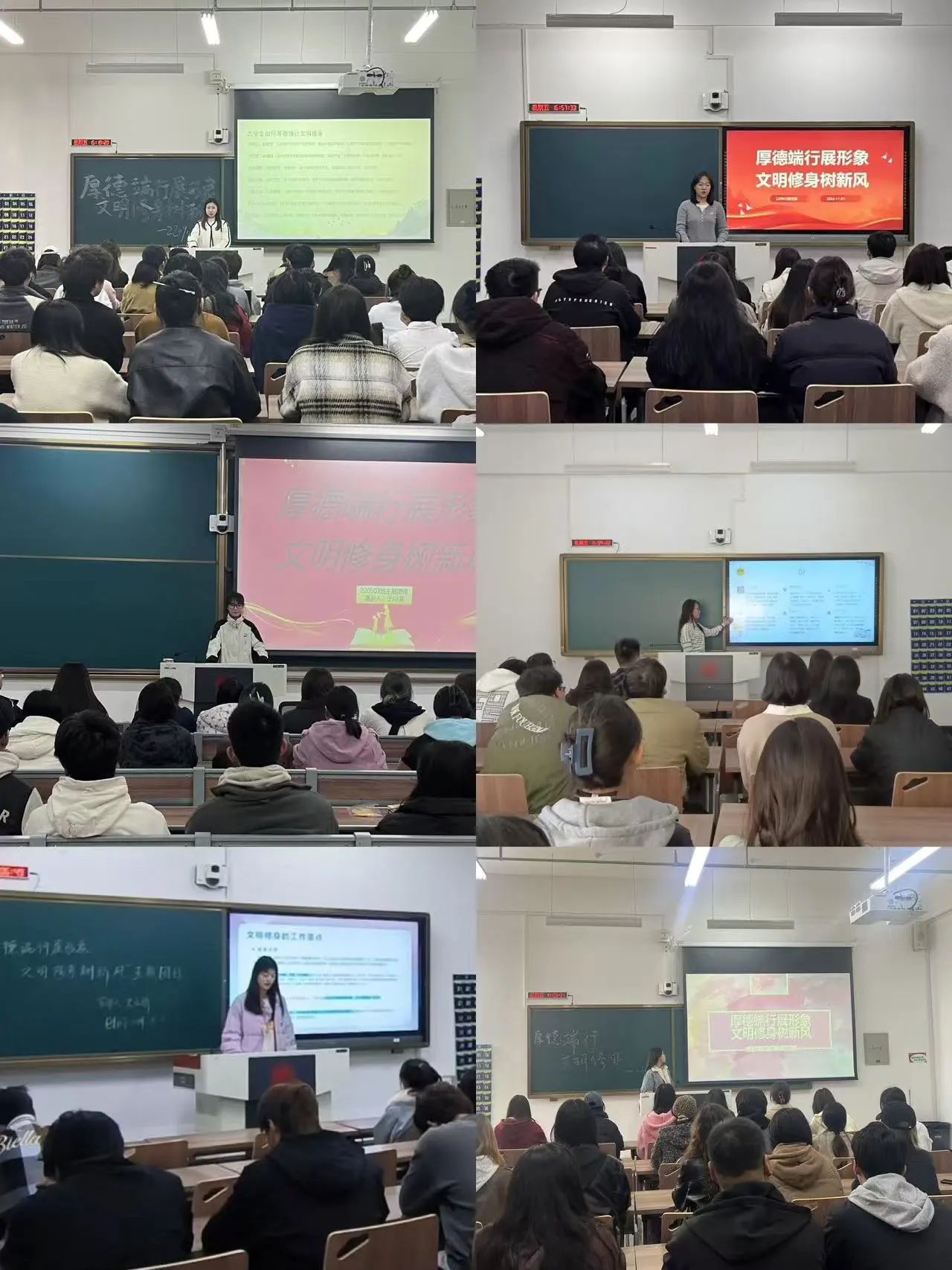本网讯(学生通讯员 姜依雯)为提高pg电子学生的思想道德水平和精神文明素养,推动形成尊师重教、礼貌待人、文明直学的校园氛围,10月28日pg电子官方网站2022级以班级为单位,举行了“厚德端行展形象,文明修身树新风”主题团日活动。pg电子2022级自大一入学以来,各班级持续坚持组织开展两周一次心理班会、安全教育、理论学习等形式多样内容丰富的系列主题班团活动,截至目前2022级开展班团主题教育活动累计270余次。