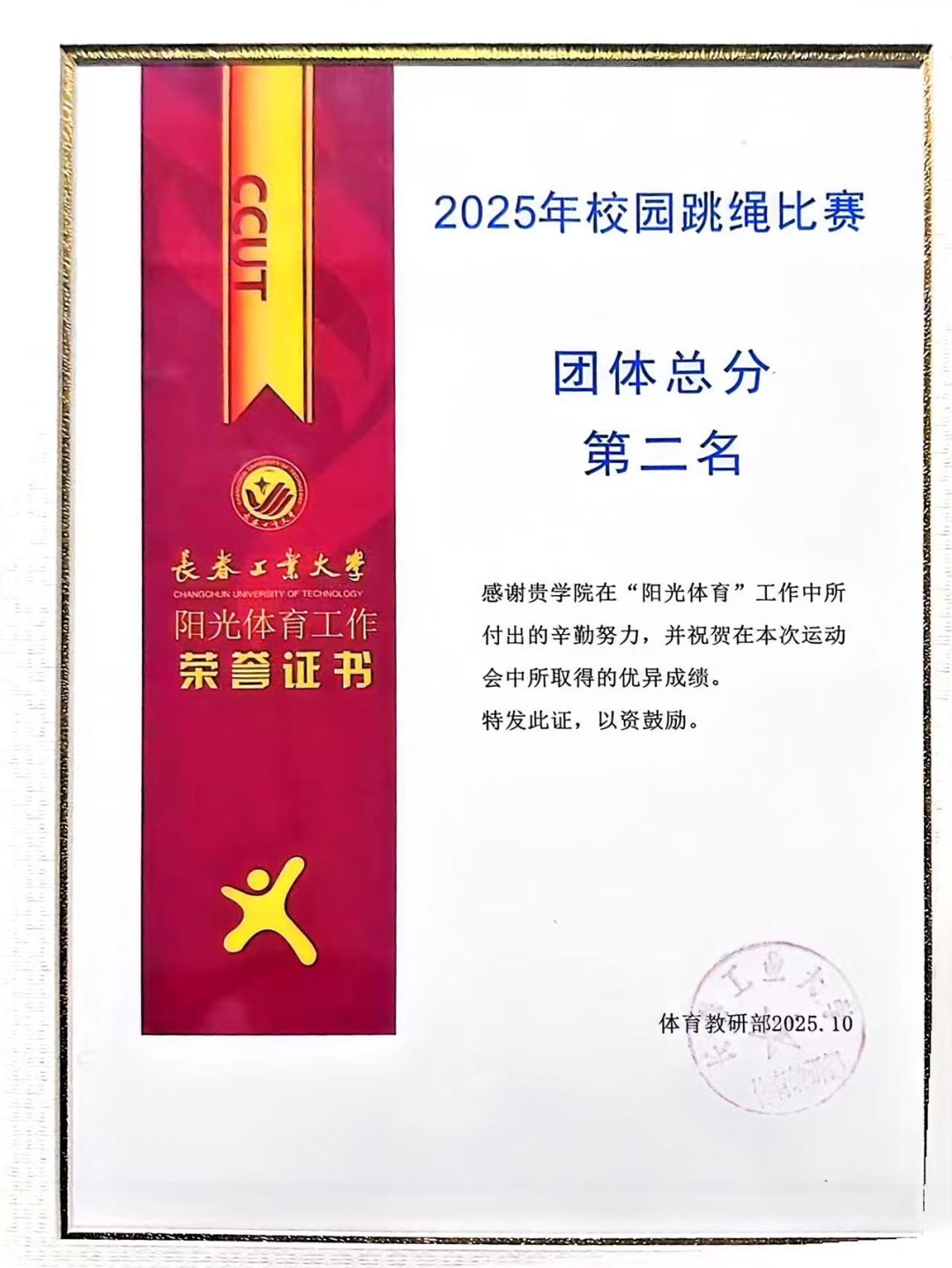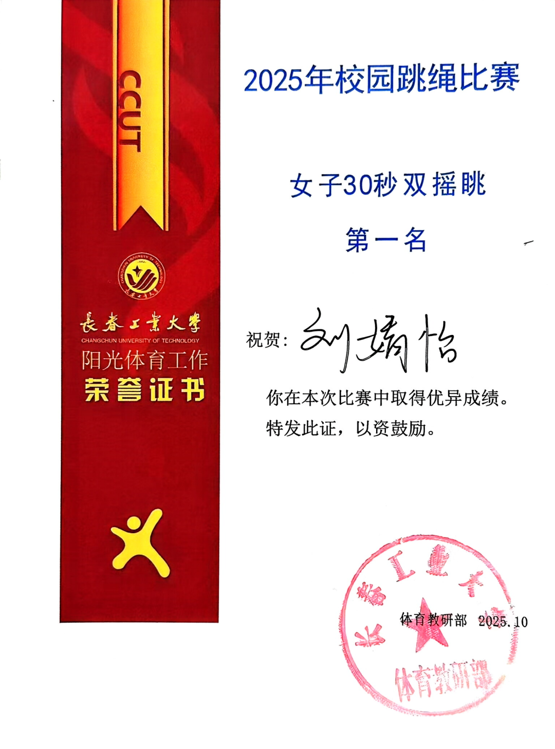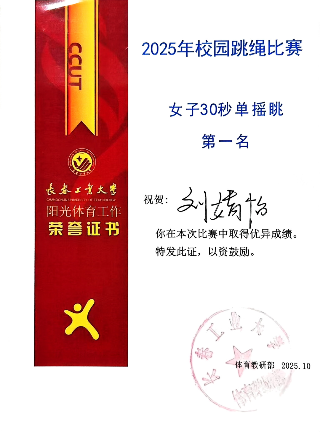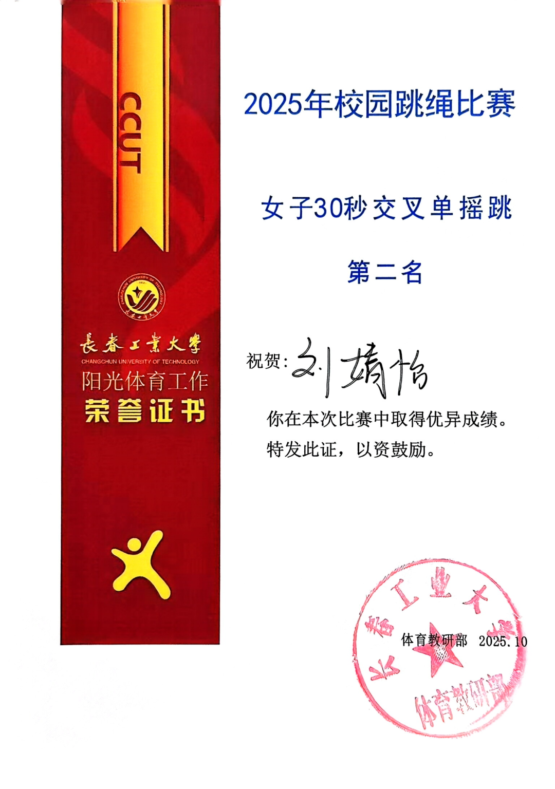 10月15日,在我校举行的2025校园跳绳比赛中,pg电子官方网站代表队以昂扬的斗志和出色的表现闪耀全场,最终荣获团体总分第二名的好成绩!其中,刘婧怡同学表现尤为亮眼,包揽女子30秒单摇跳、双摇跳第一名及女子30秒交叉单摇跳第二名。
