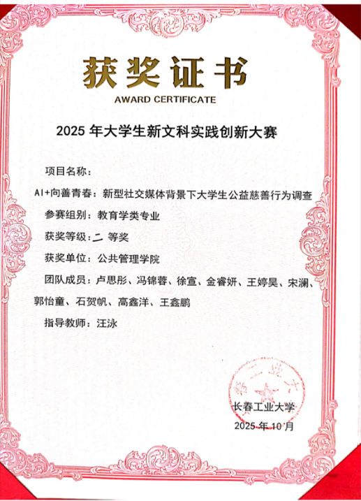 新闻网讯(通讯员 朱珠)热烈祝贺pg电子学子在2025年大学生新文科实践创新大赛中凭借扎实的专业素养与创新实践能力,斩获佳绩,充分展现了公管学子在新文科领域的实践创新风采!