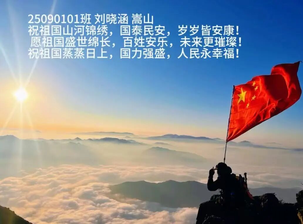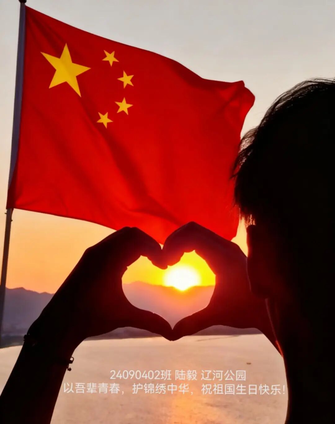 照片中,同学们手持国旗,在校园、家乡街头、旅行途中纷纷拍下照片。有的以教学楼为背景,与国旗并肩而立;有的绽开笑容,用青春姿态致敬祖国;还有的与家人共同出镜,让爱国情怀在家庭互动中传承。一张张照片里,国旗的鲜红与同学们的笑容交相辉映,洋溢着满满的自豪感。