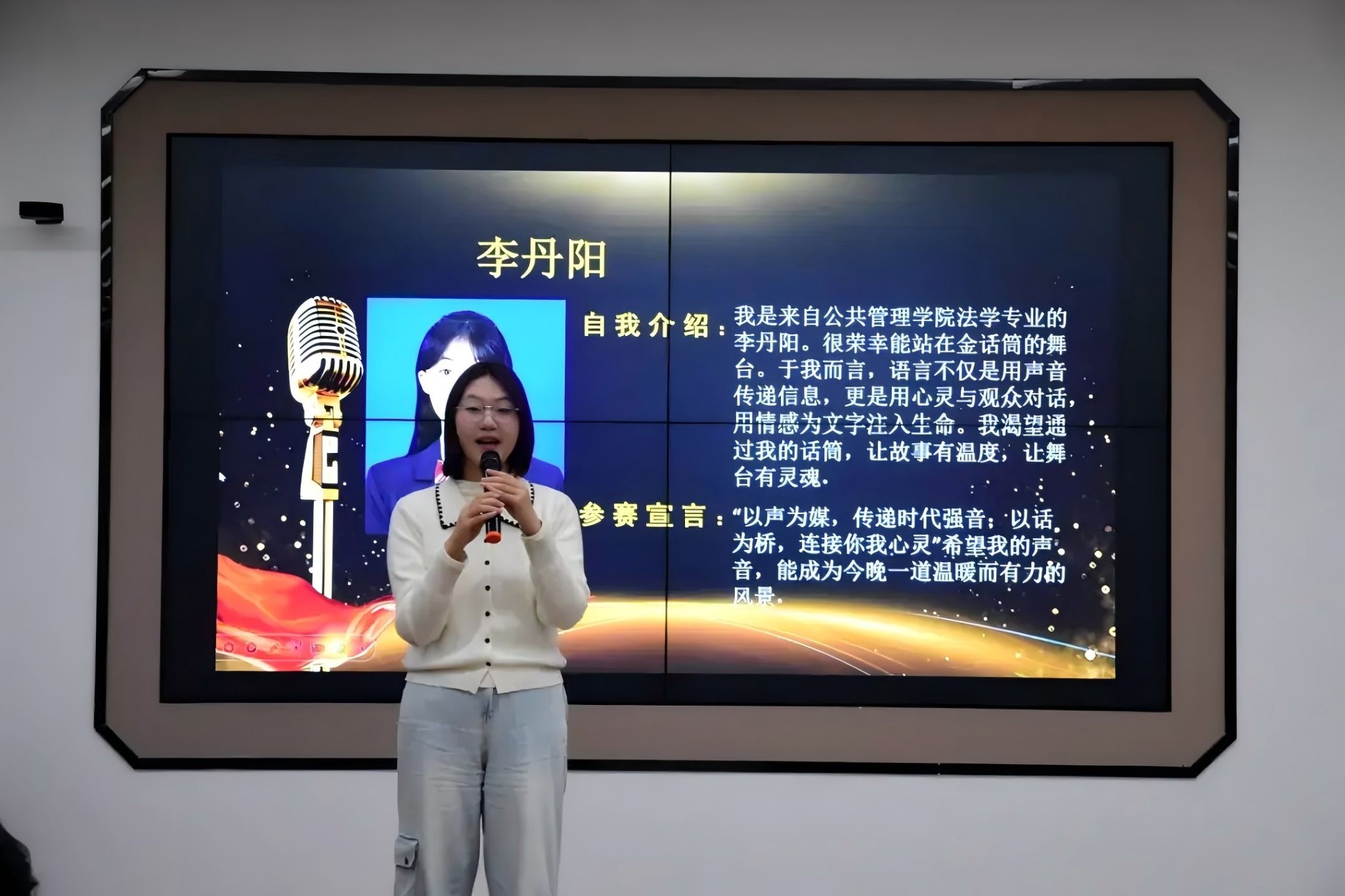 新闻网讯(通讯员 刘宸炜)“声韵暖如玉,入耳清灵;辞气慨而慷,尽显青春锋芒。”为丰富校园文化生活,营造积极向上、健康文明的校园文化氛围,提升广大青年学生的语言表达能力、逻辑思维能力,11月17日晚7时,“新声绽放,语你同行”“金话筒”主持人大赛决赛在北湖东区主楼301教室圆满收官。9名选手在本次比赛中同台竞技,学院党委组织员崔元慧老师、学生党支部书记初靖皓老师莅临指导。让我们共同回顾这场“声”与“情”的盛宴!