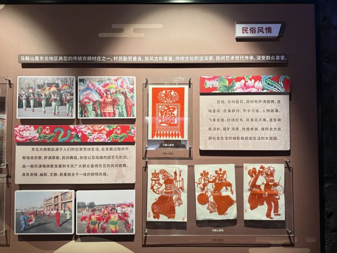 在讲解员带领下,同学们先后驻足红色印记与罗明星事迹展区,通过珍贵史料、实物展品和场景复原,重温“三下江南”战役的峥嵘岁月,聆听抗日英雄罗明星“宁为中华鬼,不做亡国奴”的铿锵誓言。随后行至民俗展区,剪纸作品陈列区尤为醒目:吉庆“福”字窗花传递着传统生活的喜意,秧歌人物主题剪纸中,萨满图腾、农事劳作等东北民俗元素清晰呈现。这些作品既承载着当地“耕织传家”的文化底蕴,又与红色记忆深度交织,正是支撑马鞍山村发展的“根与魂”。