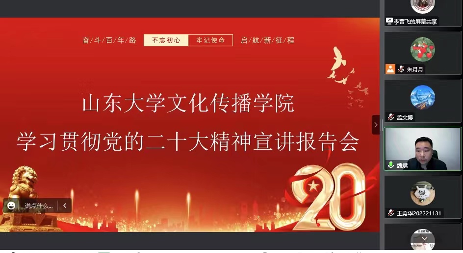 魏斌首先传达了山东大学党委书记郭新立和校长李术才为学校师生医务员工所作的党的二十大精神宣讲报告的主要精神,强调学院全体师生员工要深入全面学习宣传贯彻党的二十大精神,以强烈的政治责任感和历史使命感,坚定历史自信,增强历史主动,敢于斗争、敢于胜利,精耕细作、团结奋斗。随后,魏斌就党的二十大报告中提出的一系列原创性的新观点、新论断、新思想,重点阐释了党的二十大的主要精神和重大理论成果。结合目前学院党委在宣传贯彻落实党的二十大精神热潮中开展的活动和后续工作安排,魏斌重点谈了四个方面的学习体会:一是坚持学深悟透,率先示范,学院每一名党员干部、每一名师生员工都要深刻理解党的二十大的核心要义、丰富内涵和实践要求;二是坚守初心如磐,埋头苦干,坚守立德树人的初心,全面贯彻党的教育方针,创新优化学生培养、学科发展、人才队伍、科研创新、社会服务等各项工作;三是坚持底线思维,安全发展,要深刻认识百年未有之大变局,深入落实“3D”工作思路,主动应对疫情防控和安全稳定面临的各项风险挑战,牢牢守住学院安全底线;四是坚守不负青春,使命在肩,把做好青年学生工作作为战略性工作来抓,用心、用情、用力做好学生教育管理等工作,努力培养学生成长为有理想、敢担当、能吃苦、肯奋斗的新时代好青年。
