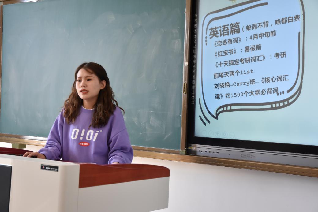 会上,周雪分科分类讲解了英语、政治、专业课的具体学习方法,并给考研同学推荐了一些自己亲测好用的书籍与网课。同时,她也提醒同学们规划好自己的备考时间,抓住分秒,调整好自己的学习状态,给予考研同学真切的关心与鼓励。