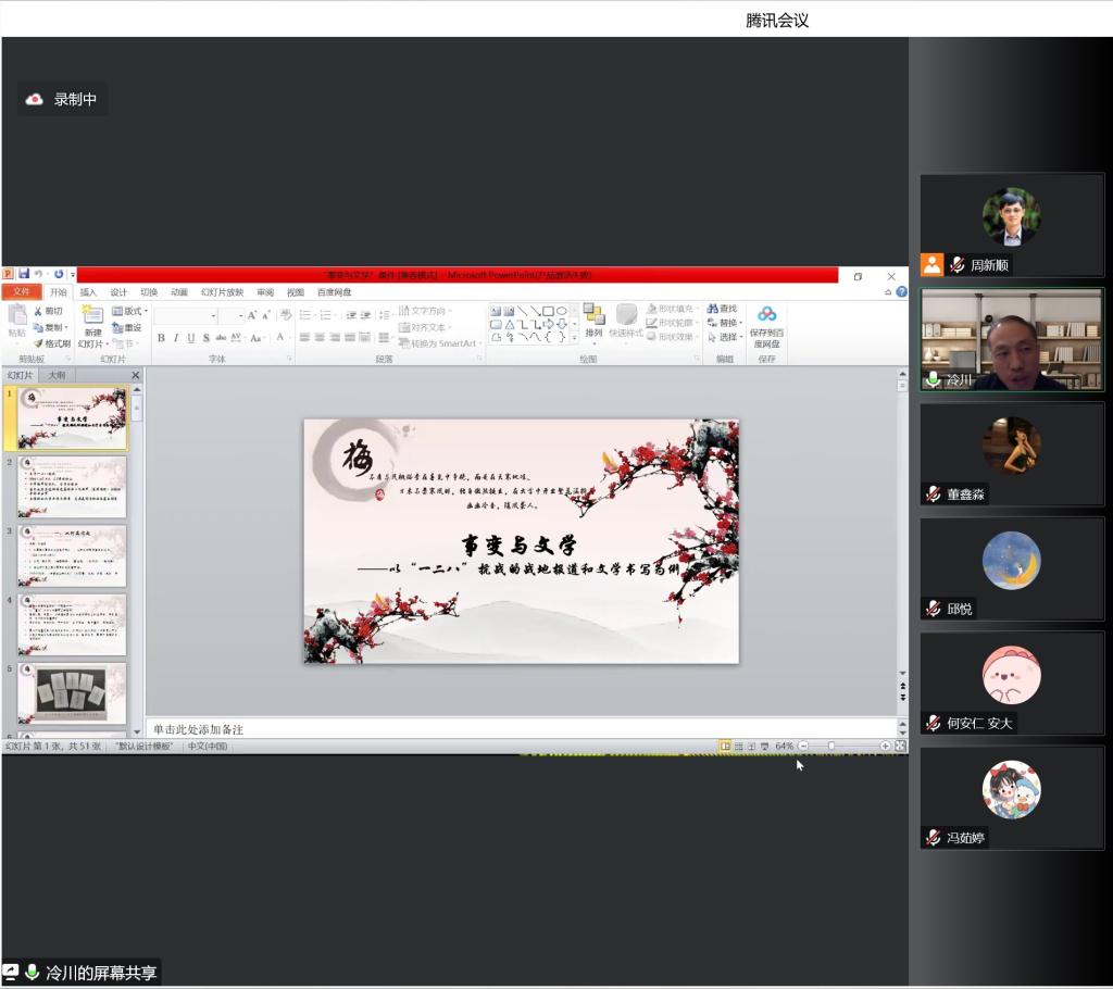 12月11日晚,中国社会科学院文学研究所现代室副研究员冷川应邀做客beat365名师大讲堂,通过腾讯会议线上平台,为beat365师生作了题为“事变与文学——‘一·二八’抗战的战地报道和文学反思”的学术报告。本次报告会由beat365中文在线官网周新顺教授主持,吸引了校内外百余人参与聆听。