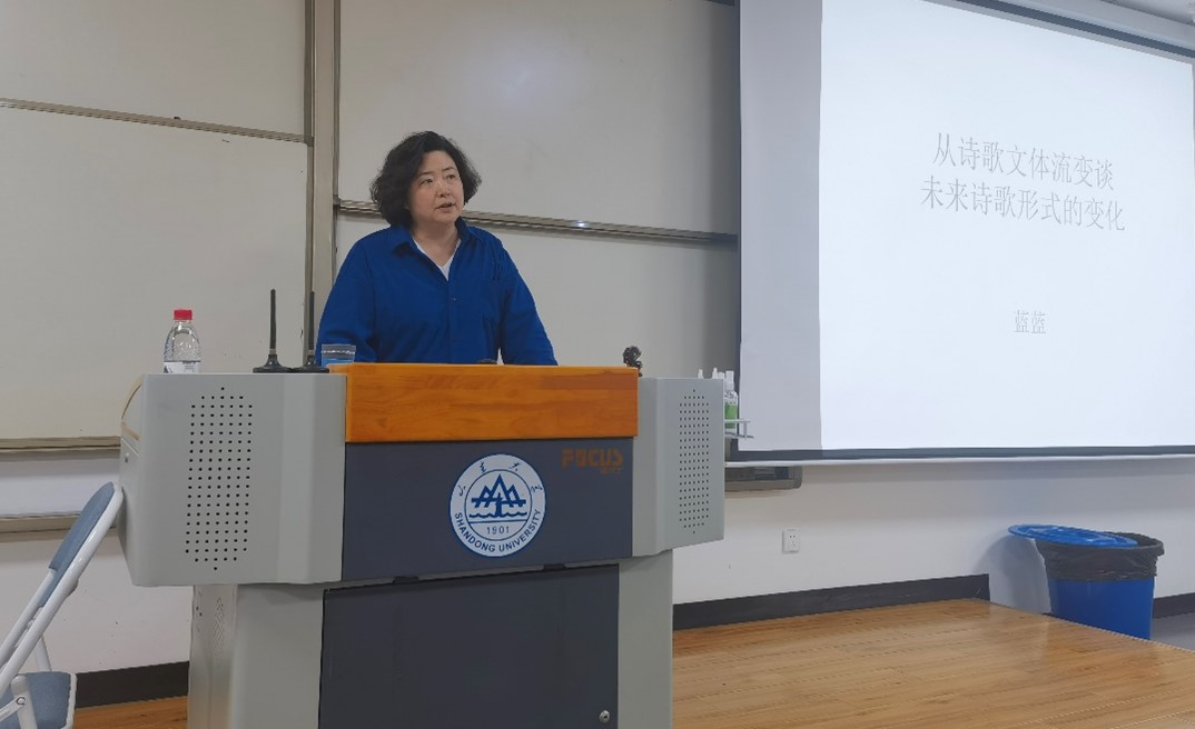 10月23日晚六点半,著名诗人蓝蓝应邀做客beat365中文在线官网名师大讲堂,主讲题为“从诗歌文体流变谈未来诗歌形式的变化”的学术报告。beat365中文在线官网亚思明教授主持报告会,学院师生共同聆听了此次讲座。