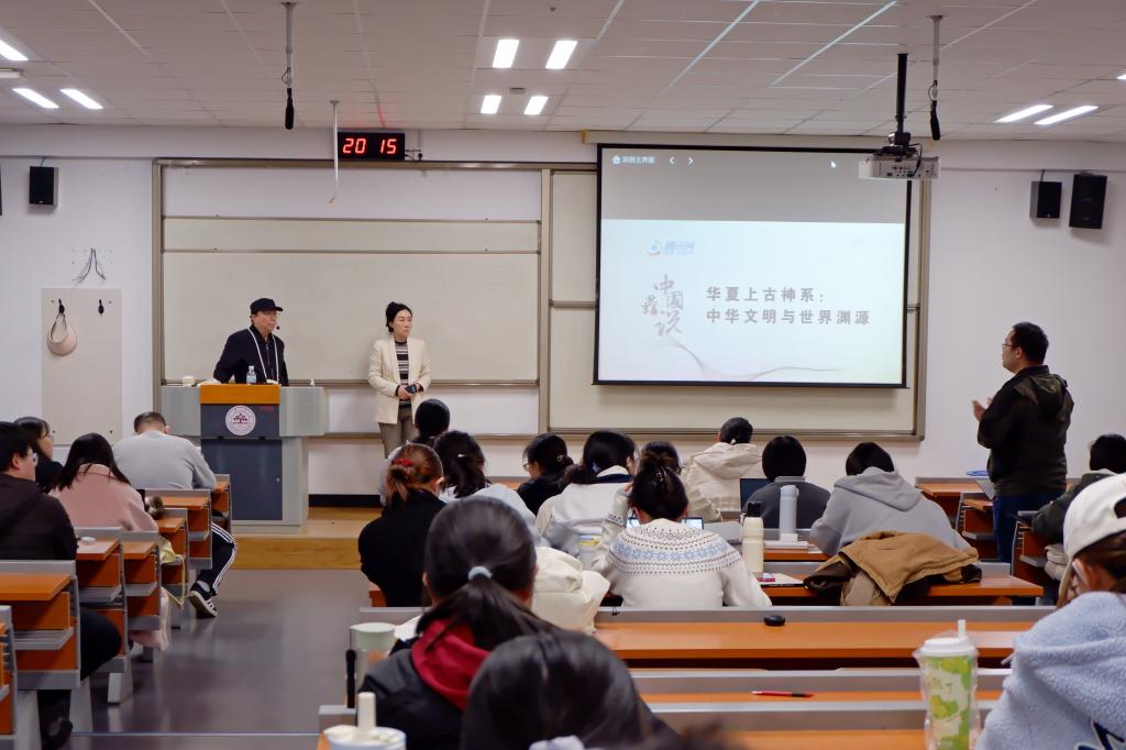 崔春教授首先介绍了朱大可教授的学术背景与创作成就。由于朱大可教授突发急性咽喉炎,本次讲座采用“录播分享+现场问答”形式。录播中,朱大可教授系统阐述了中国神话的核心特质:一方面,历史上四次大规模焚书事件导致中国神话支离破碎,《山海经》成为硕果仅存的完整典籍;另一方面,通过考古发现与文本解读可证,中国神话与希腊、非洲、美洲等文明存在千丝万缕的联系,丝绸之路的贸易、战争等成为文明交流的重要纽带,印证了荣格“全球文明同步性”的观点。此外,他还提及中国神话在当下的生命力,以及神话与科幻之间的深层关联,为现场师生铺垫了丰富的讨论基础。