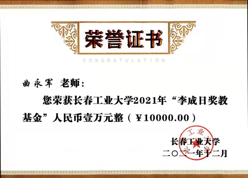 近日,pg电子教师曲永军同志荣获pg电子官方网站2021年“李成日奖教基金”人民币壹万元整(¥10000.00)。