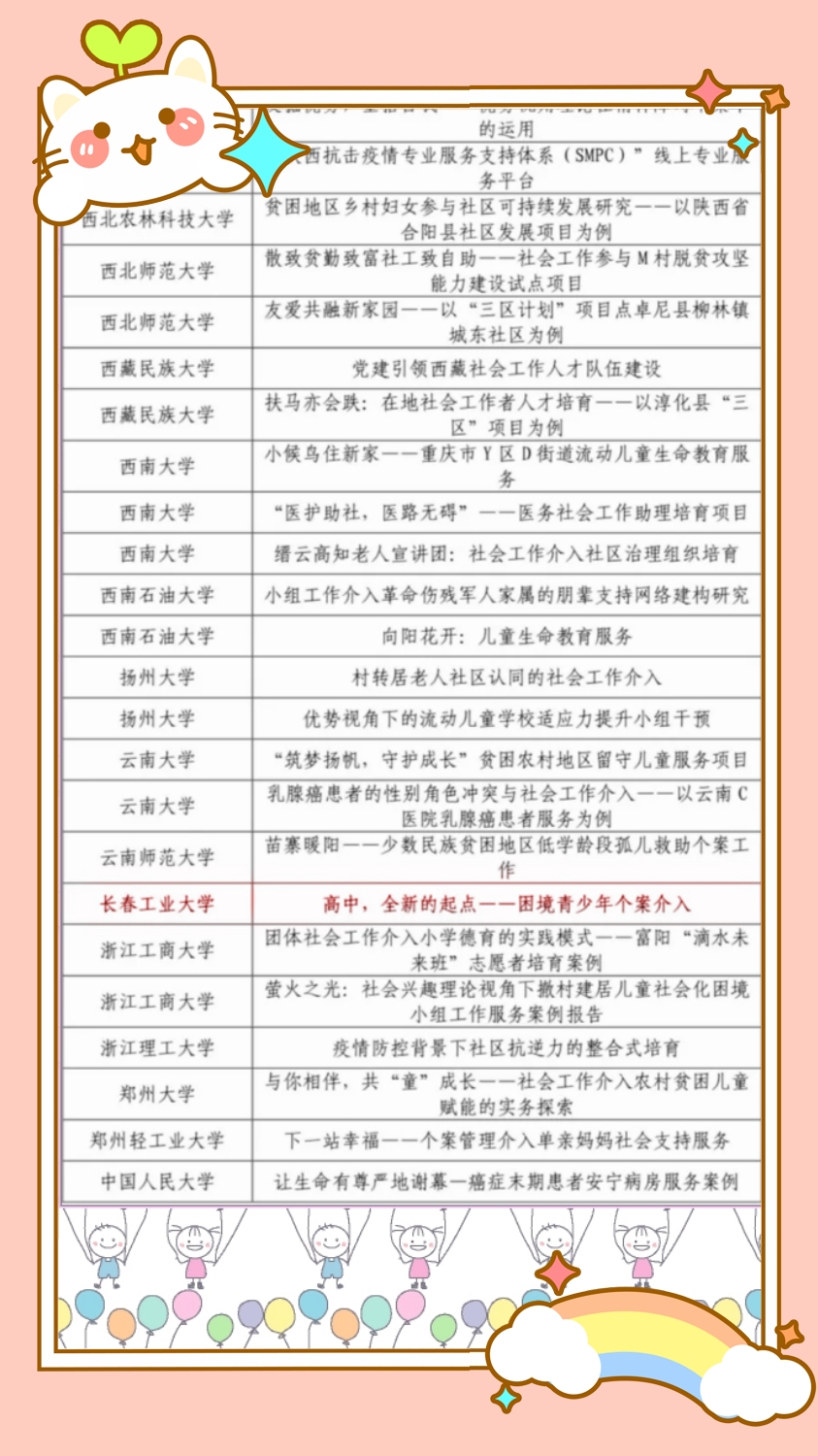 由pg电子陶宇教授指导、2020级社工专硕杨爽参与撰写的案例《高中,全新的起点——困境青少年个案介入》入选全国百强案例。在全国152所高校中,有62所高校提交的案例获此殊荣。
