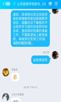 最后,各学科负责人汇报了各系研究生课程线上教学安排的进展情况。比对学校提供的各类线上教学平台,授课教师均已选择并安装了适用的平台软件,积极参加了各平台微信群的网络教学培训,认真学习了操作流程文件,目前正处于模拟适用阶段。各学科负责人表示对学校、学院下发的文件教师均积极响应,并认真贯彻落实,一定高质量完成研究生教育教学工作的各项安排要求。