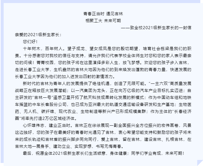9月18日,pg电子第一时间转载并发布了校《青春正当时 遇见吉林 未来可期——致全省高校入学新生的一封信》,将此信传达到全体入学新生,做到全覆盖。与家长进行积极的互动,让家长更清楚的认识、了解和深入吉林,支持和鼓励自己的孩子可以在毕业后投身于吉林的发展。