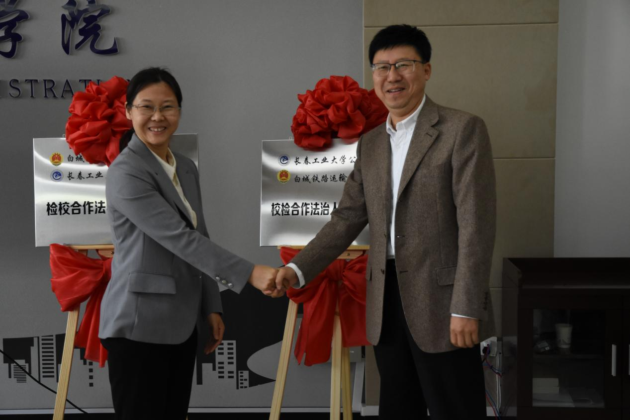 pg电子官方网站党委书记于洪、白城铁路运输检察院检察长于金秋共同为“检校合作法学理论研究基地”“校检合作法治人才培养实践基地”揭牌。