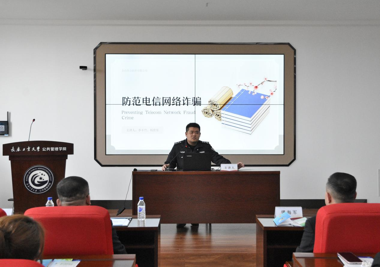 长春市公安局新区分局兴华派出所李丰竹警官以《防范电信网络诈骗》为题,解析诈骗集团的分工链条,生动介绍了刷单返利、杀猪盘、冒充公检法等高发骗局,通过典型案例揭露其作案手法,呼吁大家坚持“三不一多”原则,善用反诈工具,避免个人信息泄露。