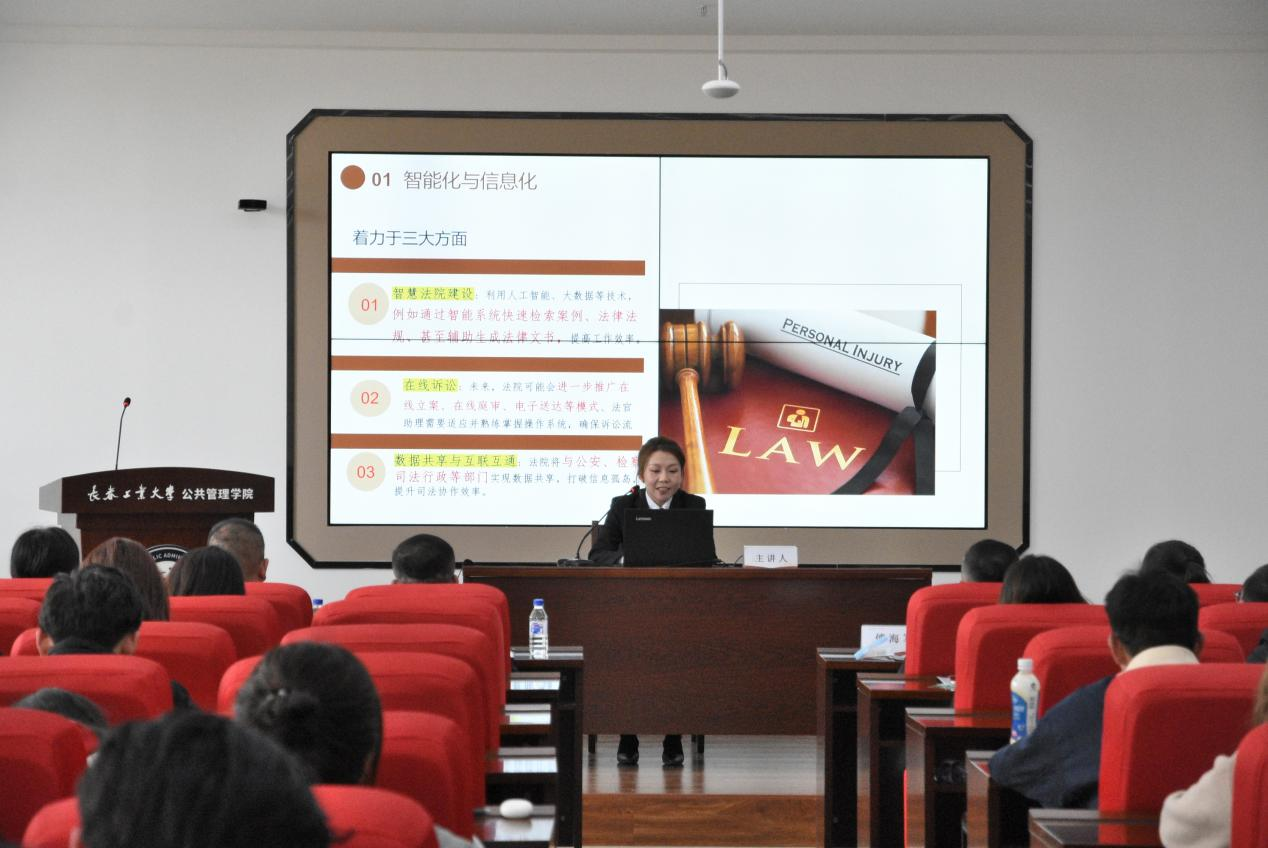 长春新区人民法院法官助理田珊以《AI时代,法律年轻人的职业前景——以法院未来发展趋势为视角》为题,围绕法院智能化的转型与职业能力重构进行,探讨智慧法院建设、案件繁简分流制度对诉讼程序的革新,指出人机协作、法律教育以及法律框架完善是未来发展方向,鼓励学子要勤奋学习,努力成为新一代的智慧法律人。