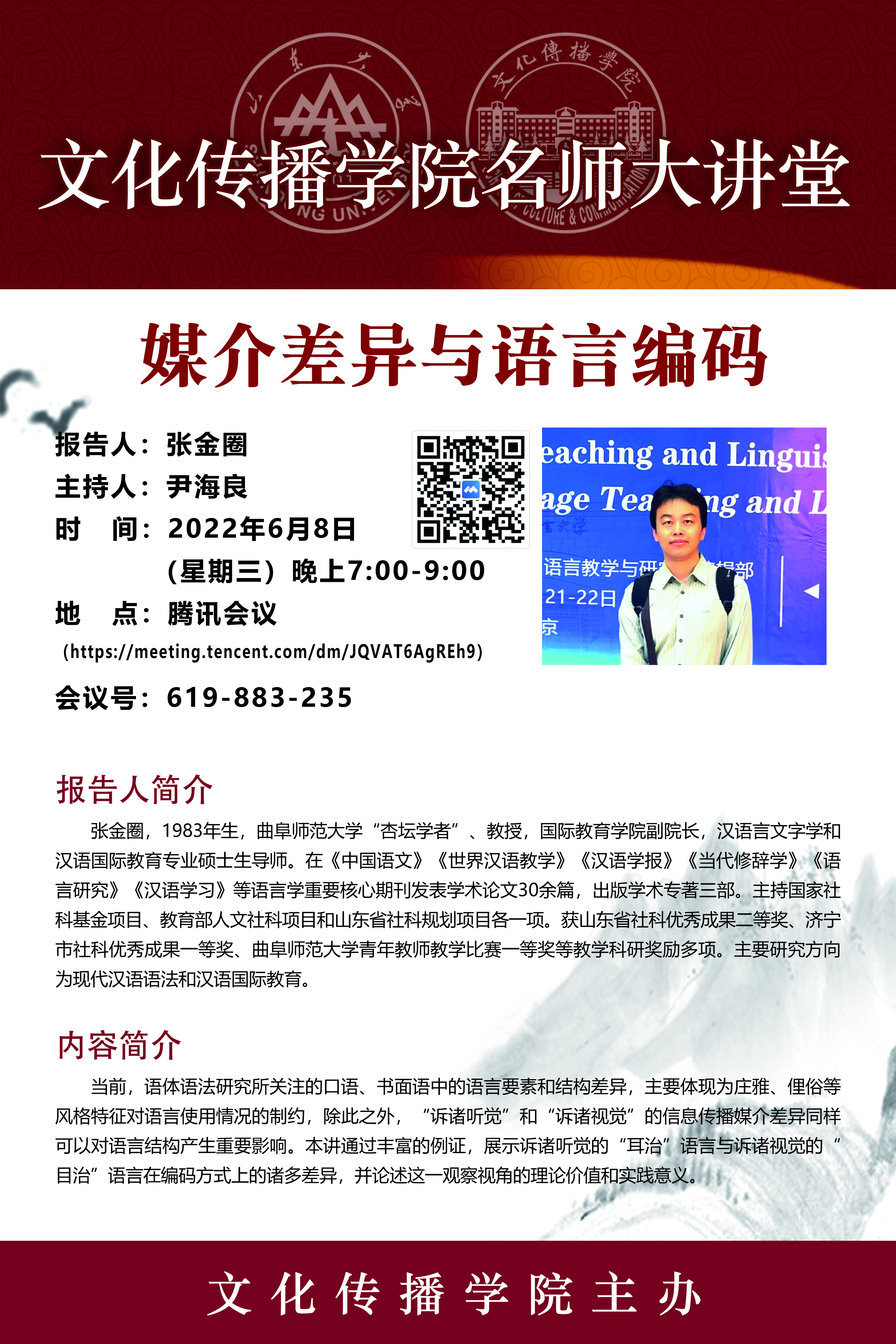 张金圈,1983年生,曲阜师范大学“杏坛学者”、教授,国际教育学院副院长,汉语言文字学和汉语国际教育专业硕士生导师。在《中国语文》《世界汉语教学》《汉语学报》《当代修辞学》《语言研究》《汉语学习》等语言学重要核心期刊发表学术论文30余篇,出版学术专著三部。主持国家社科基金项目、教育部人文社科项目和山东省社科规划项目各一项。获山东省社科优秀成果二等奖、济宁市社科优秀成果一等奖、曲阜师范大学青年教师教学比赛一等奖等教学科研奖励多项。主要研究方向为现代汉语语法和汉语国际教育。