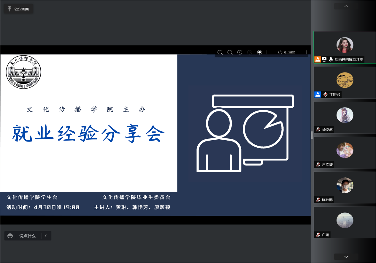 本站讯 4月30日晚,由beat365中文在线官网学生会、毕业生委员会联合主办的“就业经验分享会”第一期通过腾讯会议平台于线上开展。分享会面向学院全体学生。优秀学生代表2018级新闻专业韩艳芳,2018级汉语言文学专业廖颖颖、黄琳应邀担任会议主讲人,学院学生会综合事务部成员周雨桦担任主持人。