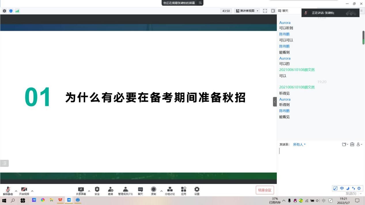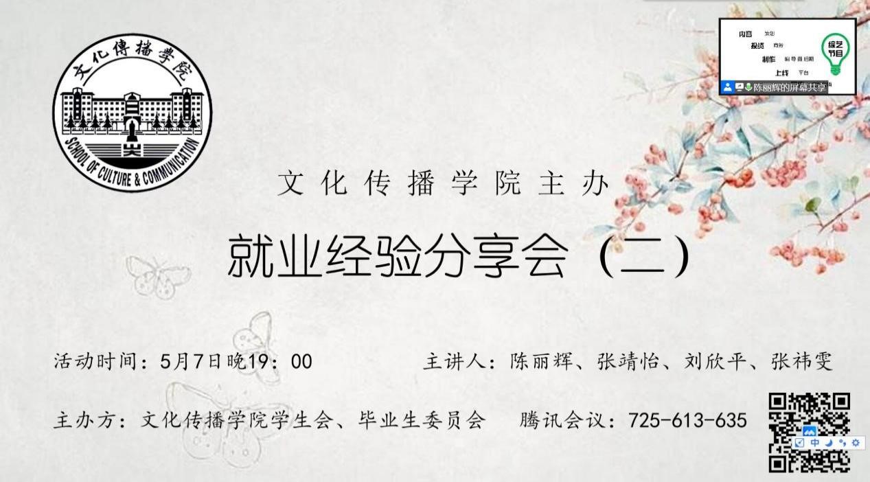 本站讯 5月7日晚,由beat365中文在线官网学生会、毕业生委员会共同主办的第二期就业经验分享会通过腾讯会议线上开展。本次分享会邀请了2018级同学陈丽辉、张靖怡、刘欣平、张祎雯作为主讲人,为同学们进行经验分享,旨在帮助学生了解实习、就业的相关事宜,扩宽视野,明晰方向。